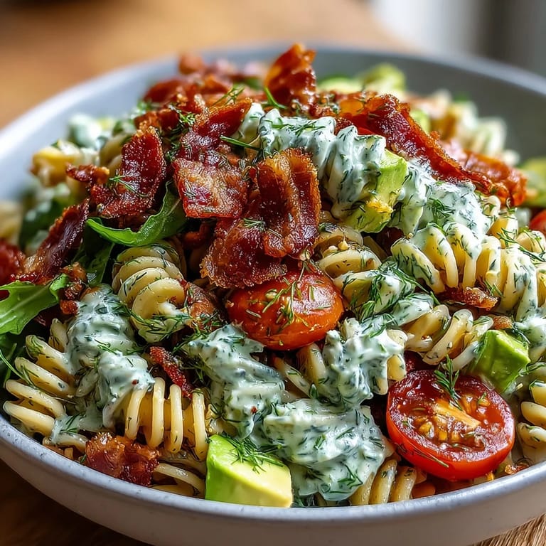 Save to Pinterest The first time I tossed together this BLT pasta with avocado ranch, the kitchen was alive with the sounds of summer& neighbors chatting through open windows, ice clinking in glasses, and the bacon crackling its own soundtrack. I hadn't set out to create anything ambitious& just wanted a quick cool meal after an afternoon in the garden. But as I layered fresh lettuce, juicy tomatoes, and crispy bacon over still-warm noodles, the scent alone told me we were onto something special. That creamy ranch dressing, elevated with avocado and herbs, looked so inviting that I snuck a taste before mixing. There's a real joy in watching simple ingredients come together, especially when the result is this colorful salad that's both familiar and exciting.