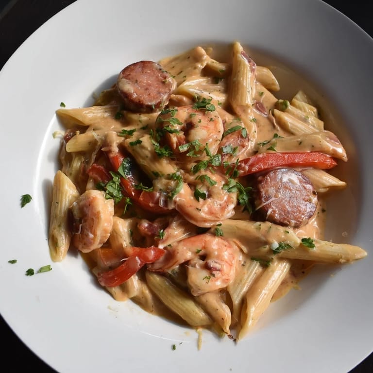 Save to Pinterest A creamy, spicy one-pan pasta featuring smoky sausage, succulent shrimp, and a rich Cajun Alfredo sauce: perfect for weeknight comfort.
