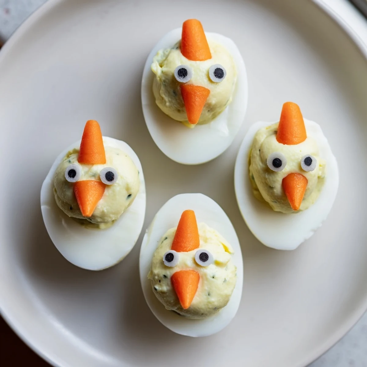 - Spoon or pipe the mixture back into the egg white halves to create plump chick bodies. Use small carrot triangles for beaks and black peppercorns or sesame seeds for eyes. Optional Add small carrot feet at the base.