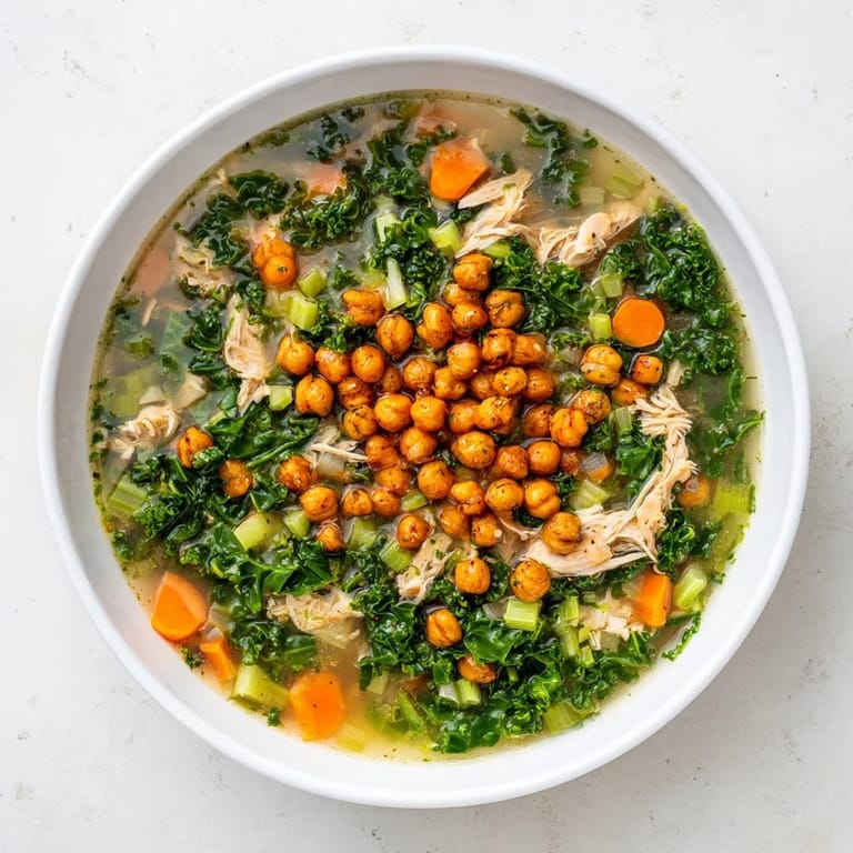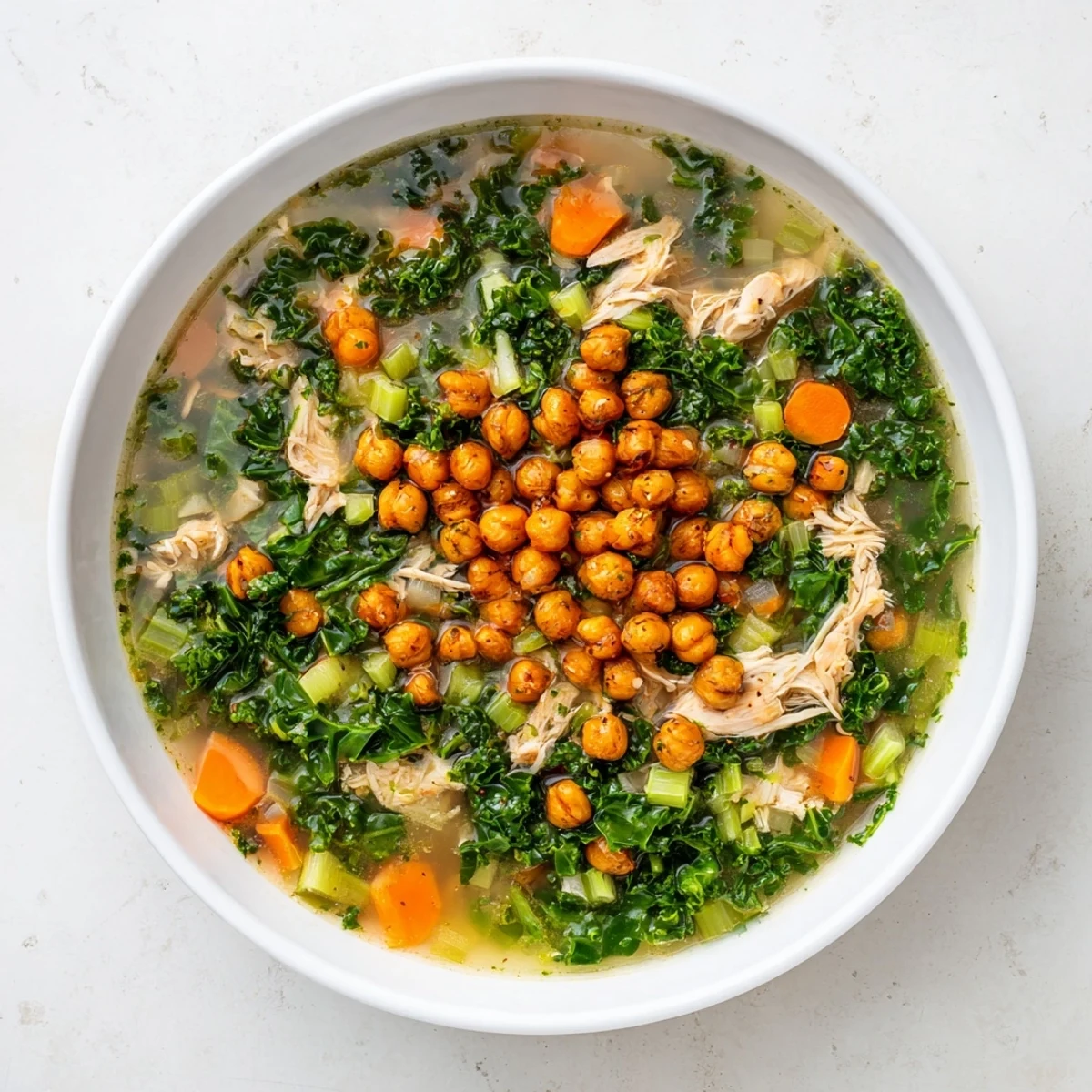 Save to Pinterest A hearty, nourishing soup featuring tender chicken, vibrant kale, and a delightful topping of spiced, crispy chickpeas—perfect for a comforting, healthy meal.