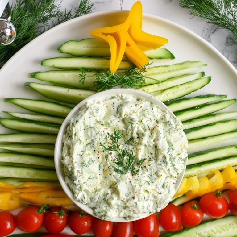 Save to Pinterest A vibrant, festive platter featuring a creamy dip surrounded by a decorative arrangement of cucumbers and tomatoes in the shape of a holiday tree—perfect for parties or gatherings.