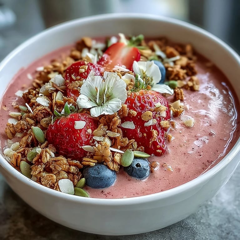 A smoothie bowl without toppings is just a bowl of pink mush, but the second you add granola and fruit and texture, something shifts—it becomes a real breakfast that asks to be celebrated. The crunch against the creamy base, the bright tartness of fresh berries, the sweetness of honey drizzled on top—it's all conversation in a bowl. I've learned that spending an extra two minutes arranging things intentionally makes people slow down and actually taste what they're eating instead of just wolfing it down on the way out the door.