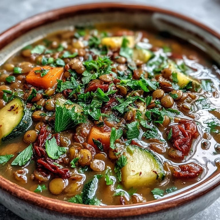 This soup genuinely tastes better with crusty bread alongside it—something to tear and dunk, to soak up the broth and give your hands something to do while you're eating. A squeeze of fresh lemon right before serving does something unexpected to all those spices, brightening them and making everything feel more alive. If you're inclined toward wine, a crisp Sauvignon Blanc echoes the brightness of the lemon and cuts through the earthiness of the lentils in the nicest way.