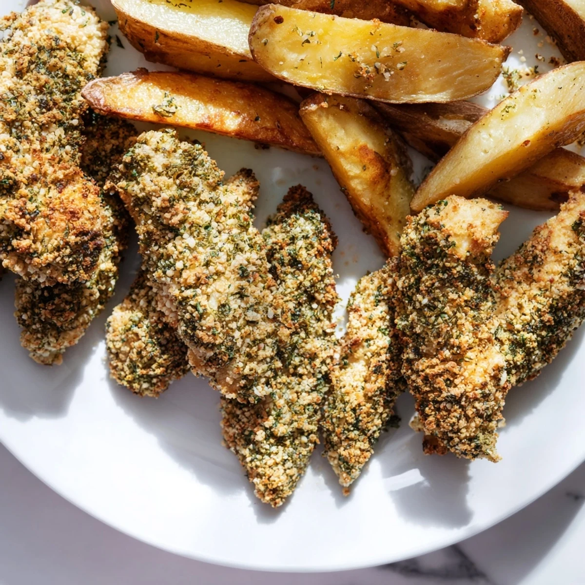 Save to Pinterest Juicy chicken tenders coated in fragrant herbs, served with crispy, golden-brown potato wedges for a wholesome and flavorful meal the whole family will love.