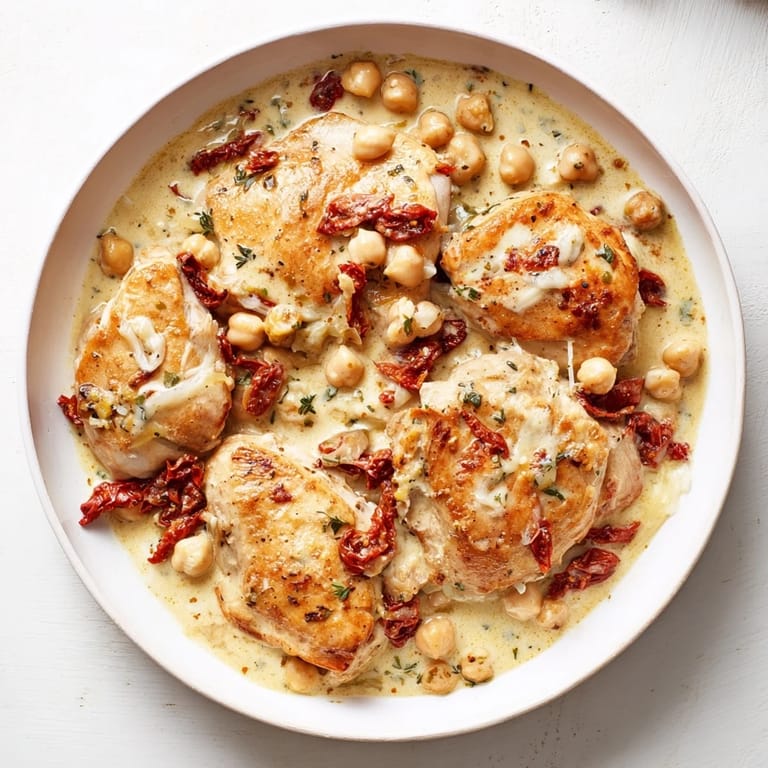 Save to Pinterest A creamy, savory chicken dish enriched with sun-dried tomatoes and protein-packed chickpeas, perfect for a healthy and satisfying dinner.