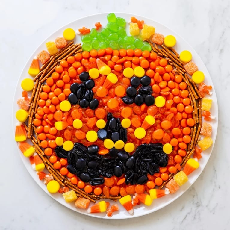 Save to Pinterest A festive and vibrant candy platter arranged in the shape of a Jack-o-Lantern perfect for Halloween parties and gatherings. This sweet treat board is customizable and sure to delight both kids and adults.