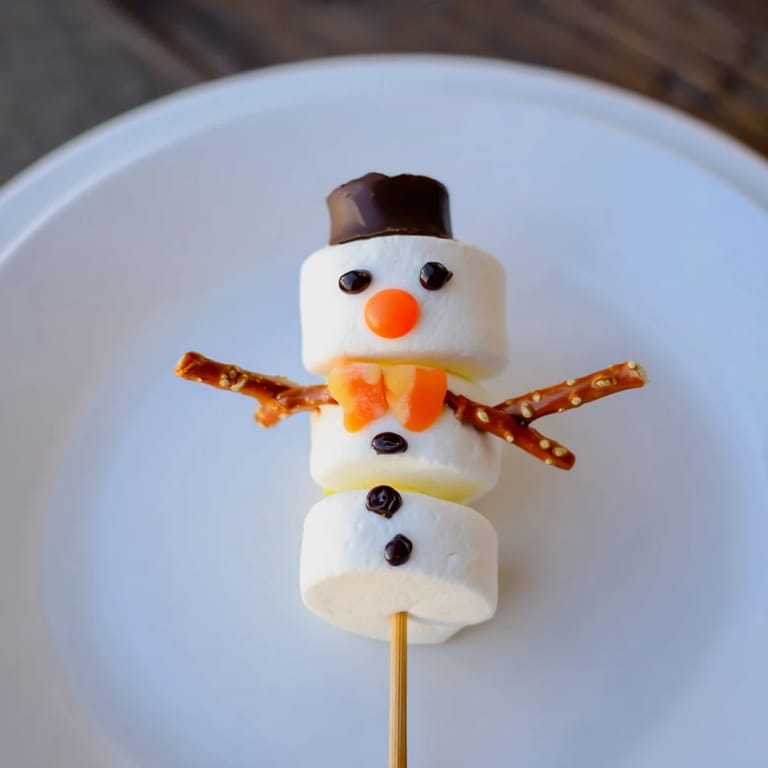 Thread three marshmallows onto a wooden skewer, then use melted chocolate to attach decorations like eyes, buttons, and hats. Add pretzel arms and candy scarves for character.