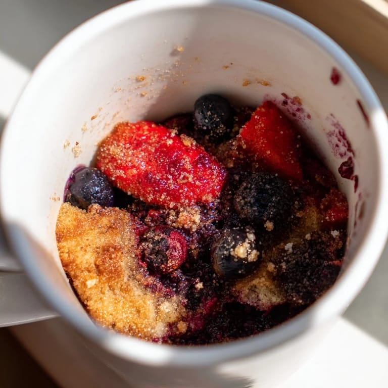 Save to Pinterest I was hunting through my freezer for something sweet when I spotted a half-empty bag of mixed berries wedged behind the ice packs. The microwave hummed while I waited, and two minutes later I had a bubbling, fragrant dessert that tasted like summer cobbler without any of the fuss. It became my go-to whenever I needed something warm and comforting but didn't want to dirty a single baking dish. The berries burst and pool at the bottom while the batter puffs up into a golden crust that's somewhere between cake and biscuit. Now I keep frozen berries stocked just for nights like these.