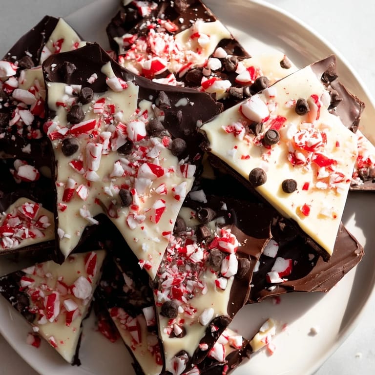 Save to Pinterest A festive, no-bake dessert featuring crisp layers of chocolate and white chocolate, studded with crushed peppermint candies and served as playful, shareable shards.